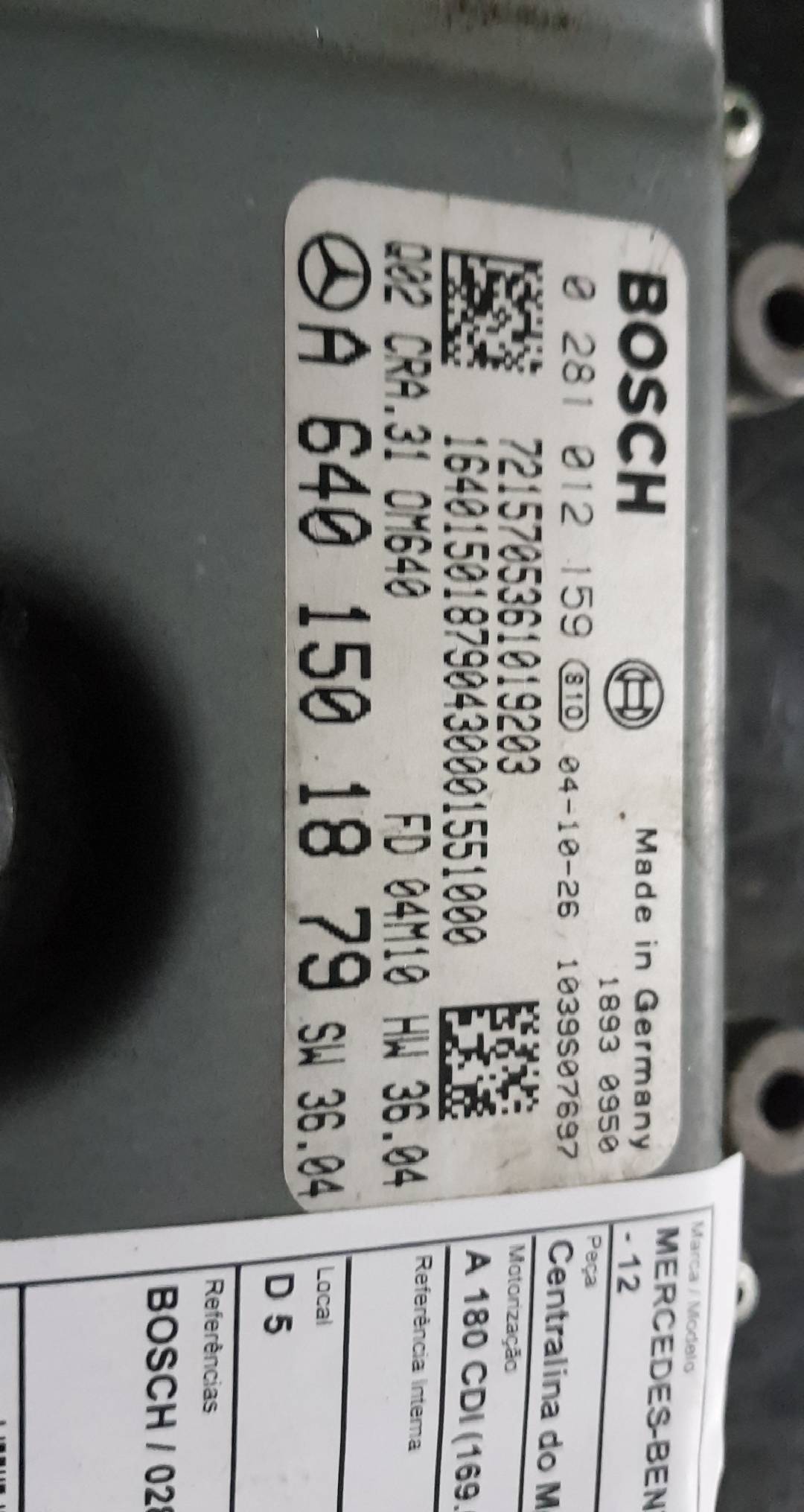CENTRAL UNIT / ENGINE MODULE MERCEDES-BENZ A-CLASS (W169) | 04 - 12 BOSCH | 0281012159 | A6401501879 TELEPECAS Reference: 903784 ID Stock: 20152563 05 Jun 2024 |